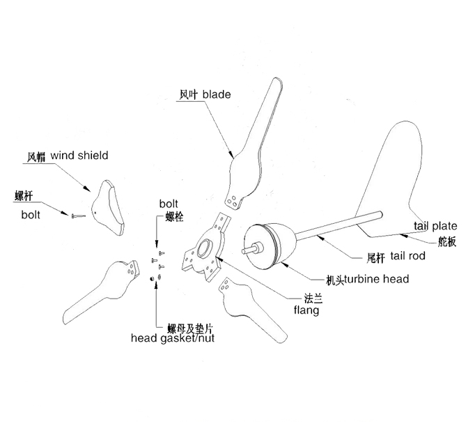6、獨特的尾舵預偏設計,自動精確對準迎風方向,提高輸出功率同時兼顧調整和強風保護。